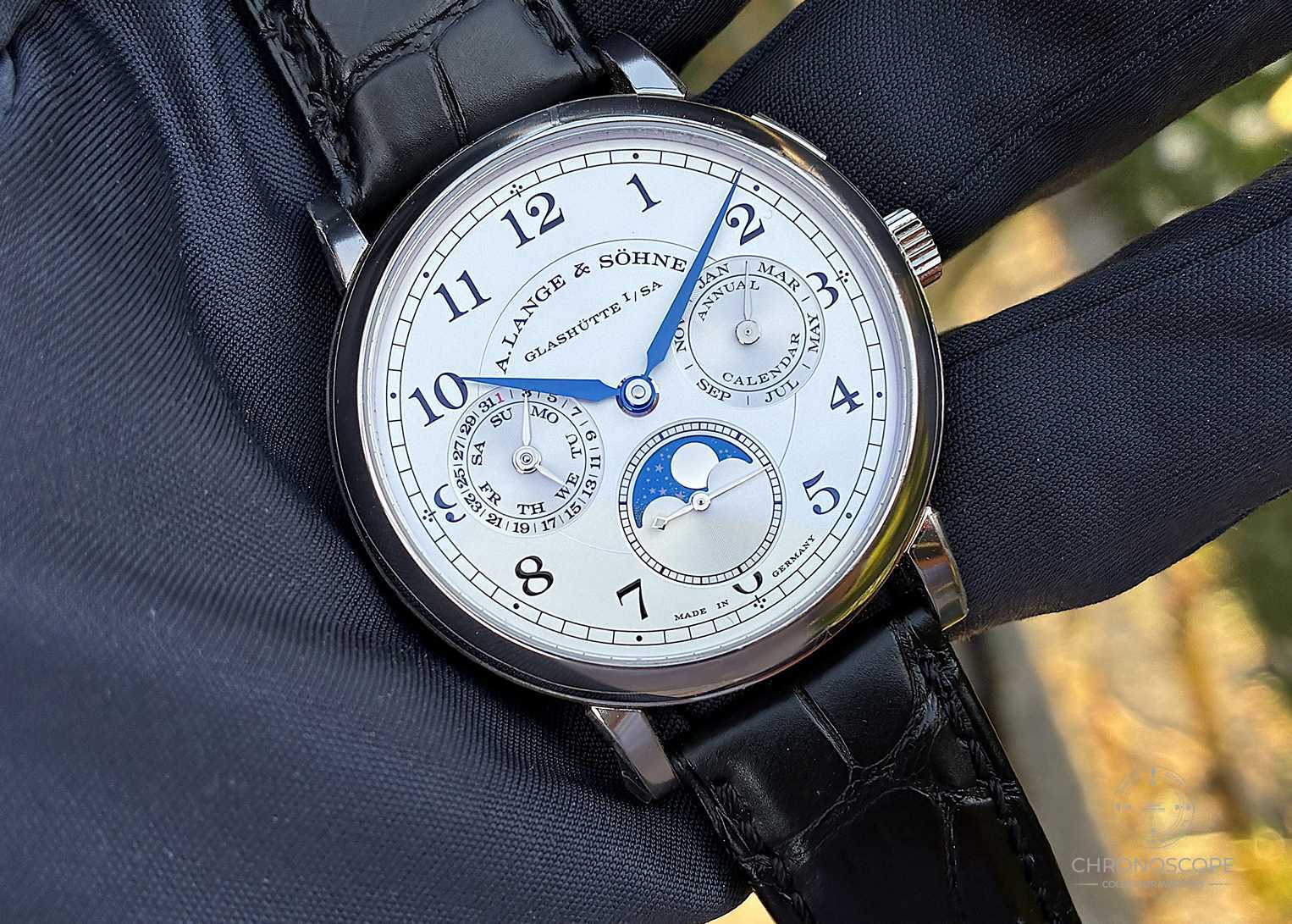 Der 1815 Jahreskalender ist sächsische Uhrmacherkunst in ihrer reinsten Form. Hergestellt in Glashütte von A. Lange & Söhne, einer Manufaktur, die für deutsche Präzision und Handwerkskunst auf höchstem Niveau steht.