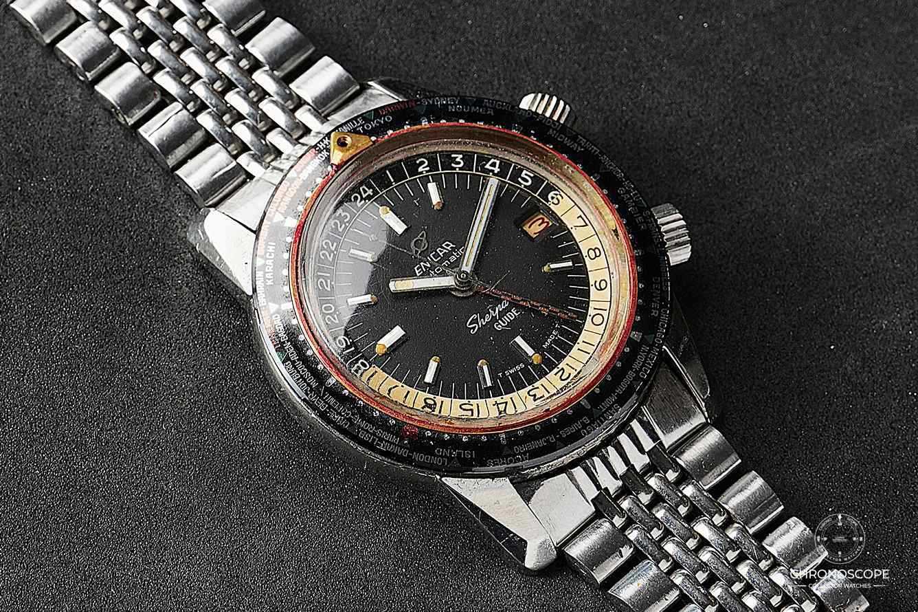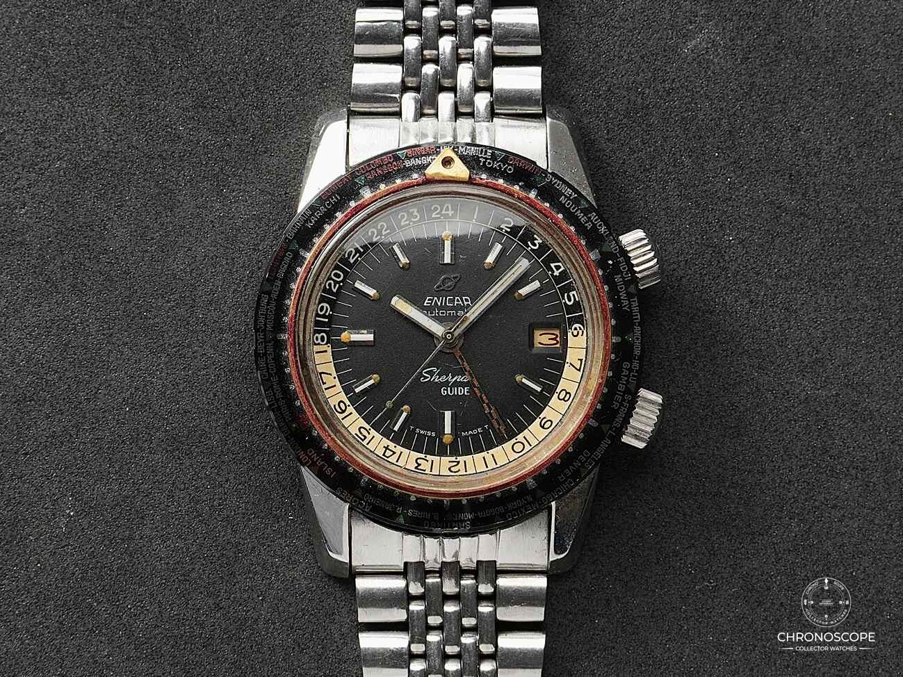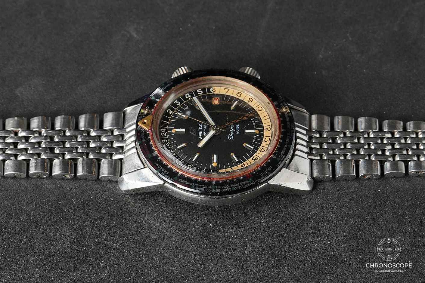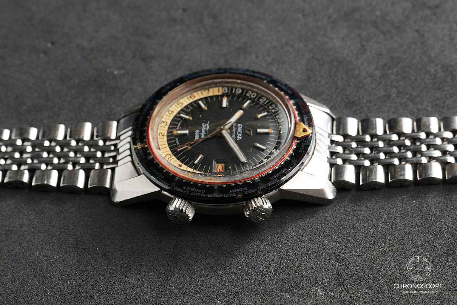 This very model has utilitarian toolwatch hints written all over, it combines a Super Compressor case, a 24 hour inner rotating bezel, a GMT hand and a world timer outer bezel. This is an honest vintage tool watch in original and overall good condition, and comes fresh from service by a well known Enicar specialist.
