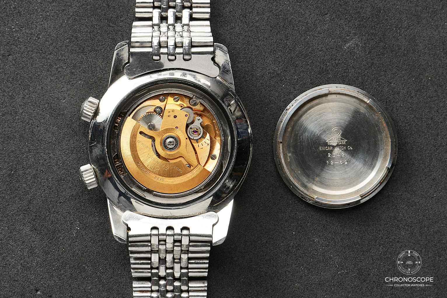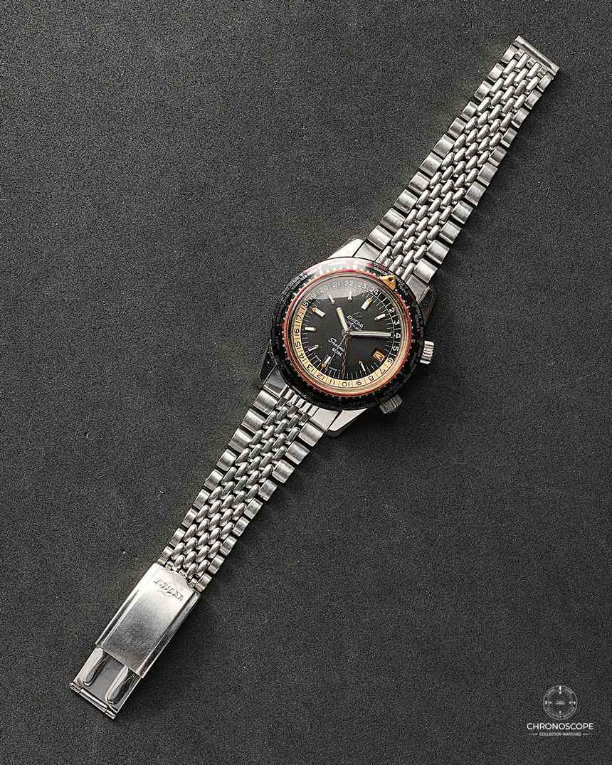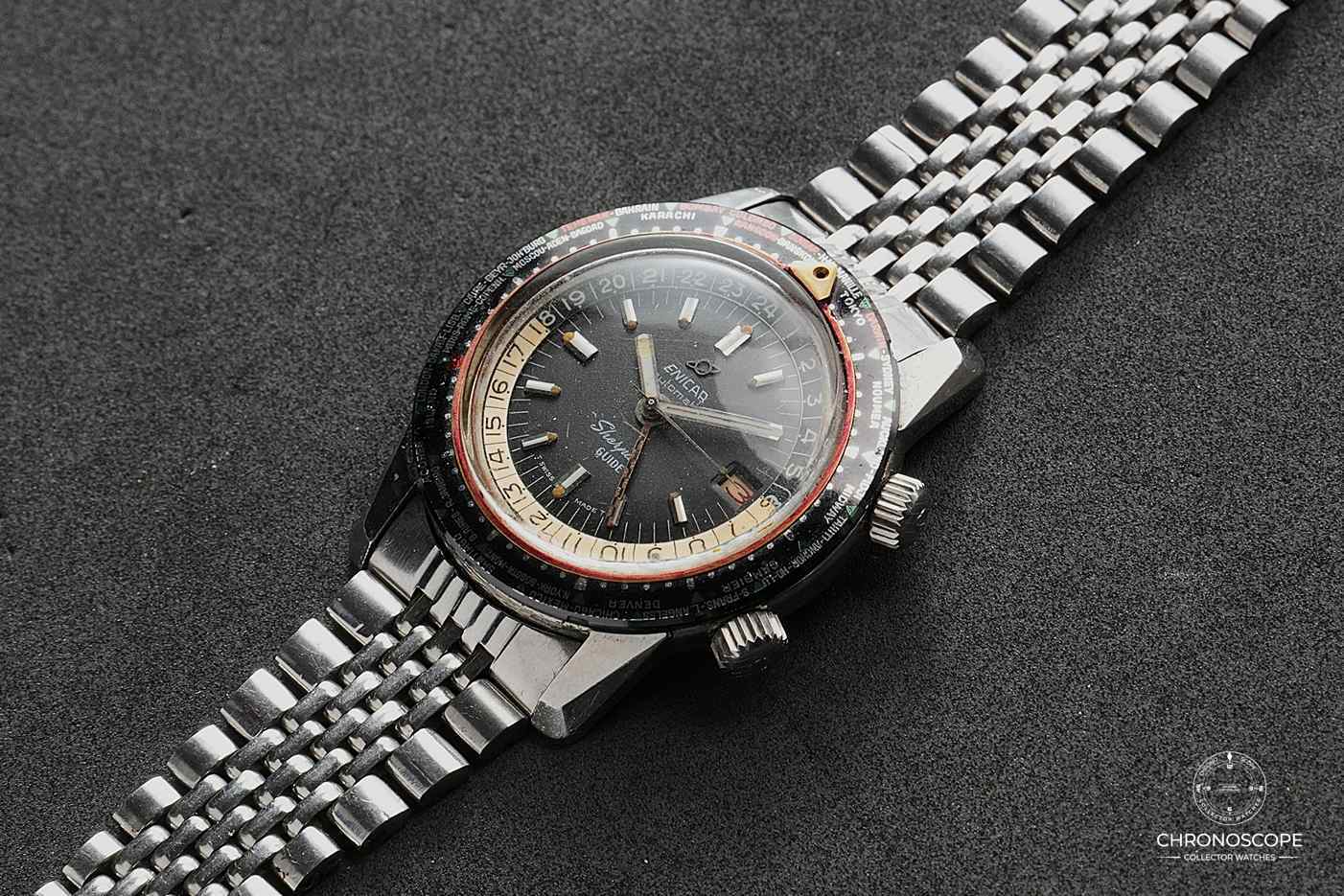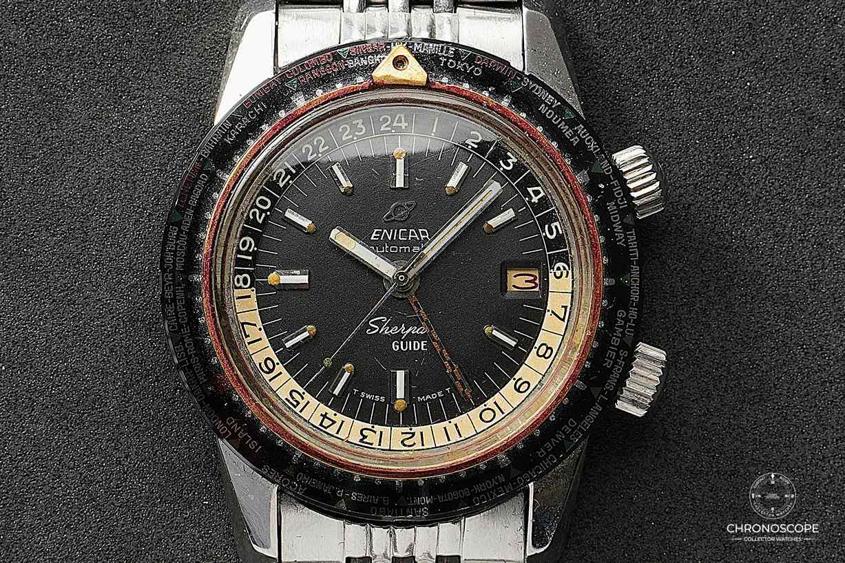 This very model has utilitarian toolwatch hints written all over, it combines a Super Compressor case, a 24 hour inner rotating bezel, a GMT hand and a world timer outer bezel. This is an honest vintage tool watch in original and overall good condition, and comes fresh from service by a well known Enicar specialist.