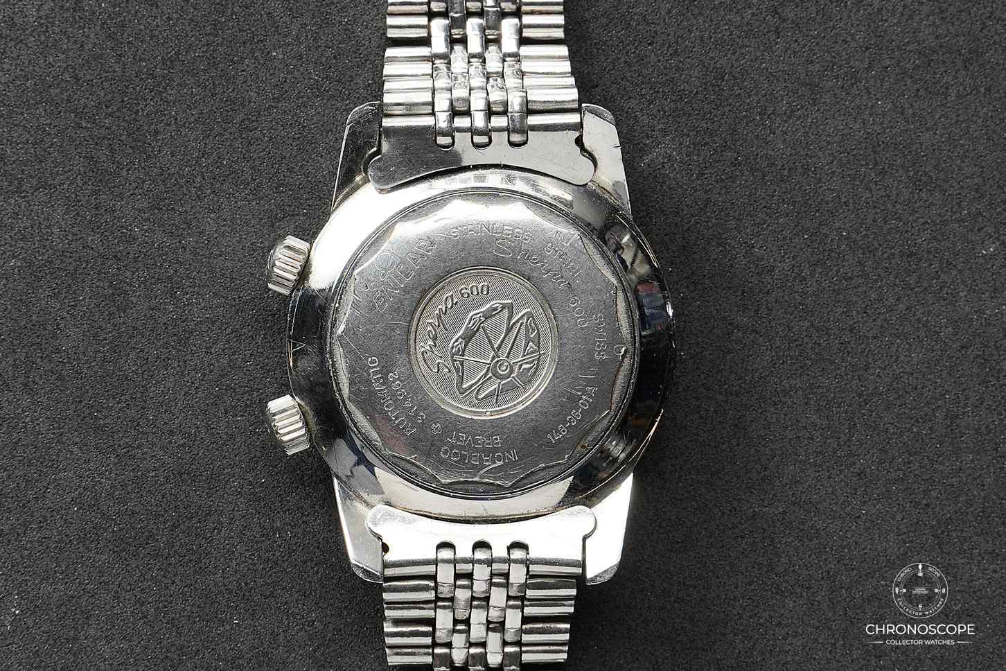 CASEBACK: The watch has the bayonet case back unique to Enicar referred to with a different patent number than other Super Compressor cases. The original stainless steel caseback is in quite good condition, showing a clear Sherpa clamshell logo at the center and signs of use. The engraved text is crisp and the caseback appears unpolished.The inner caseback is stamped with the right nomenclature, from the signature diver’s helmet to the marking 2342 and 12-69.