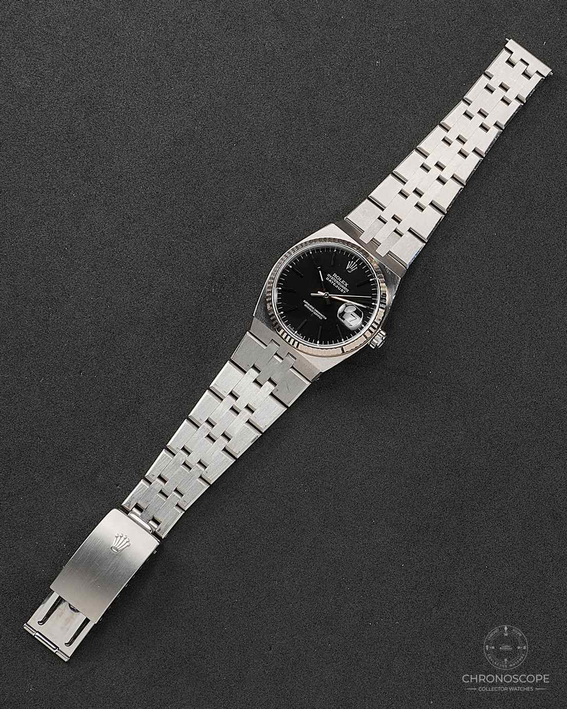 Rolex Datejust Oysterquartz ref. 17014A with perfect black dial, sharp case, serviced We are proud to offer a Oysterquartz ref. 17014A, P serial from 2000 with razor sharp case and mint black dial. The original caseback sticker is still present. It has been serviced in Jan. 2024 and comes with 12 months warranty.